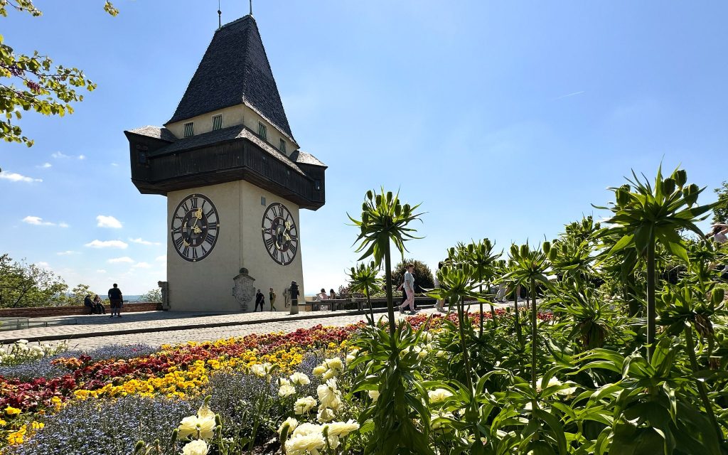 Spring flowers brighten Graz’s Uhrturm